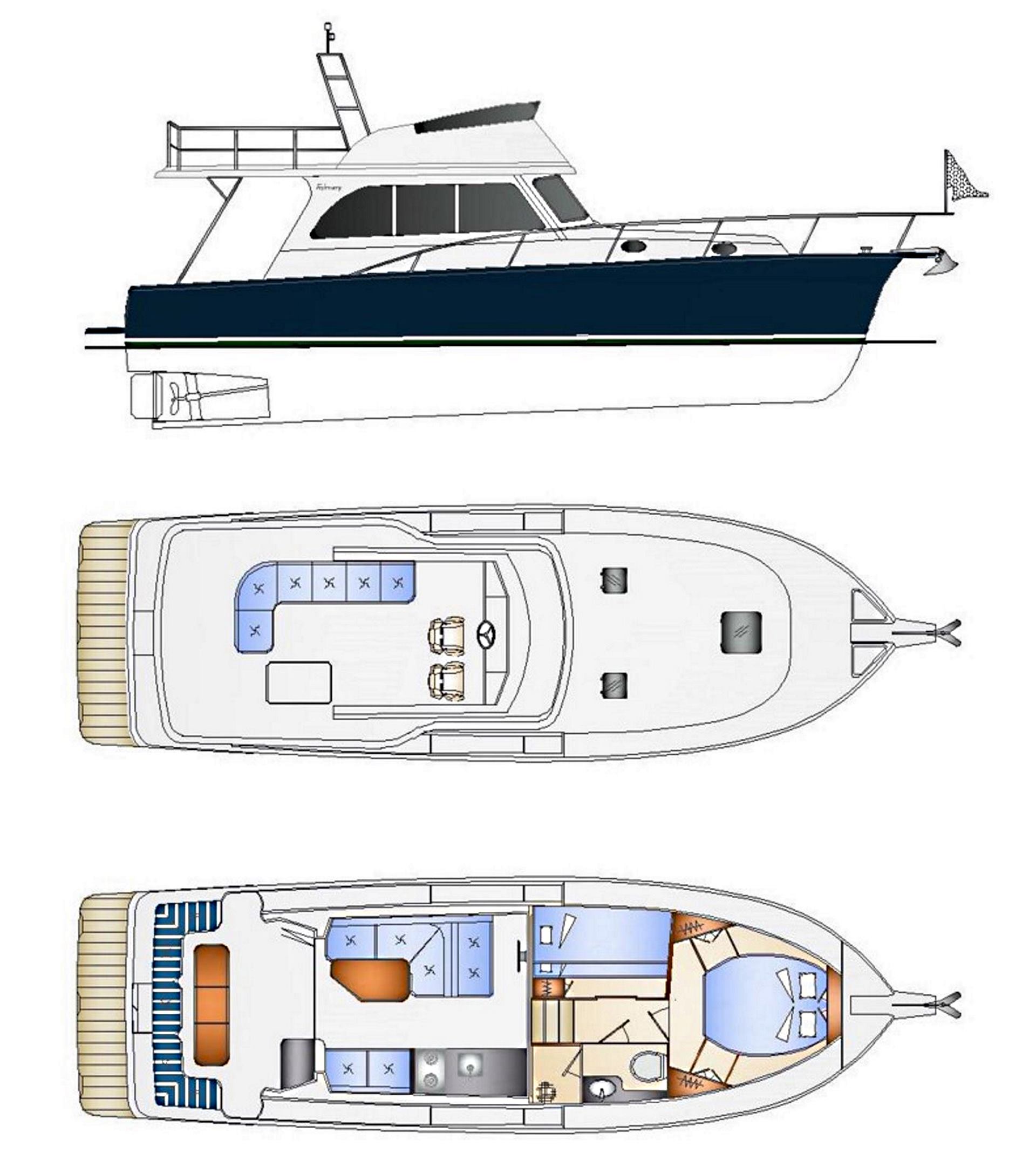 Introducing the New Fairway 37 Flybridge. All New Model now with Walk-around Side Decks and luxurious internal fit out. This all new model Fairway 37 Flybridge features twin bridge helm seats with a “ L” shaped lounge aft. The full length Flybridge hardtop over the cockpit allows you plenty of space on the bridge for dinghy storage or simply an entertaining deck for you and your guests.
